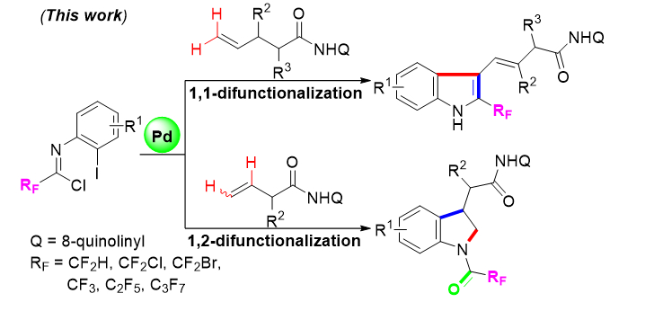 陈铮凯副教授和吴小锋教授课题组一直致力于三氟甲基取代含氮杂环的高效合成研究,近年来发展了一系列三氟甲基合成子参与的串联环化反应构建含三氟甲基氮杂环的方法,在著名化学期刊《Green. Chem.》,《Org. Lett.》,《Org. Chem. Front.》,《Adv. Synth. Catal.》,《Chem. Commun.》, 《Chin. J. Chem.》,《J. Org. Chem.》,《Org. Biomol. Chem.》上发表SCI论文二十余篇。近期,他们在未活化烯烃双官能化合成含三氟甲基氮杂环领域取得研究进展,发展了钯催化的底物结构控制的未活化烯烃区域选择性双碳氢官能化反应,以廉价易得的三氟乙酰亚胺氯(TFAICs)为三氟甲基合成子,合成了一系列三氟甲基取代的吲哚和氮-三氟乙酰基取代的吲哚啉化合物。
