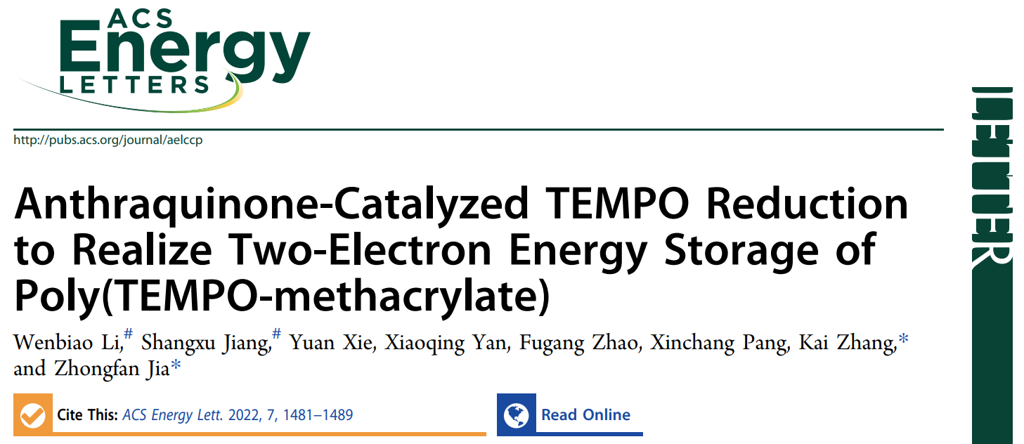 球盟会化学系张凯博士在国际知名期刊ACS Energy Letters (2021年影响因子23.101)发表了题目为《Anthraquinone-Catalyzed TEMPO Reduction to Realize Two-Electron Energy Storage of Poly(TEMPO-methacrylate)》的研究论文。球盟会研究生李文彪和蒋尚旭为论文共同第一作者,张凯博士和弗林德斯大学贾中凡博士为论文的共同通讯作者,公司为第一完成单位。