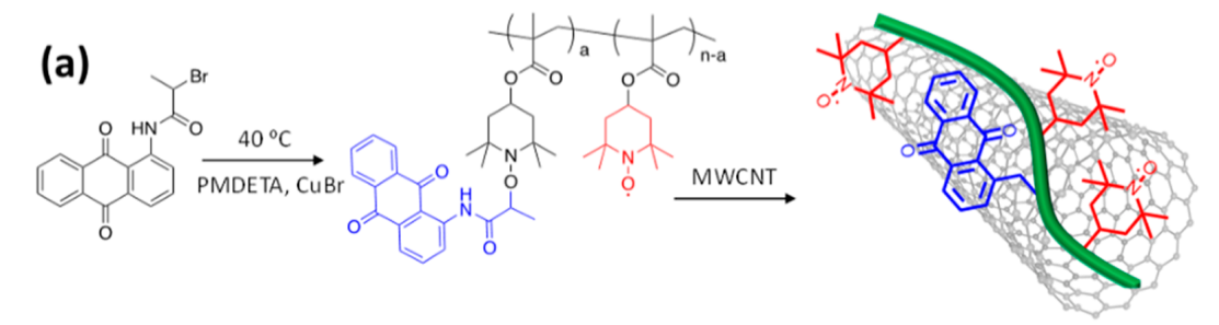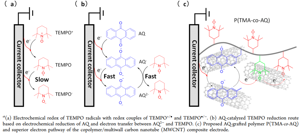 含有AQ的聚合物与多壁碳纳米管之间显示出较强的相互作用,从而实现纳米尺度的包覆而形成剑鞘结构。该结构有利于电子从聚合物转移到载流体,而且有利于电解质离子的传输。在最后的电池测试中,P(TMA-co-AQ)的充放电曲线有着两个显著的放电平台,而PTMA的第二电子(还原)过程则具有较大的过点位,没有明显的放电平台,结果证实AQ的催化过程也可以在电池中实现。