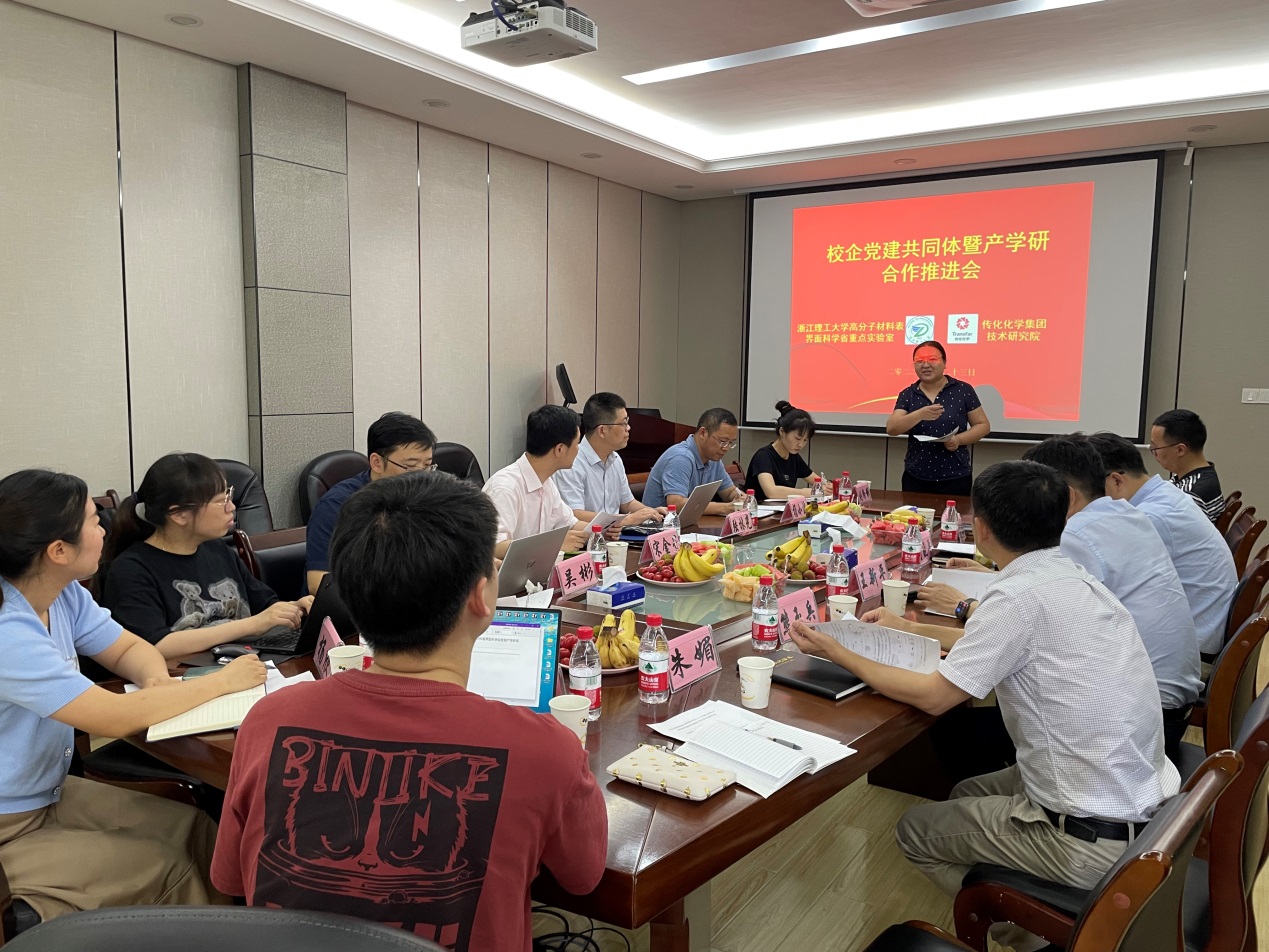 6月23日下午,球盟会化学系教工党支部与传化化学集团技术研究院举行校企党建共同体暨产学研合作推进会。传化化学集团技术研究院副经理宋金星,经理助理陆林光、功能添加剂研究所所长杨小波、531实验室主任吴彬,化学系学科带头人王新平,浙江省高分子材料表界面科学实验室主任熊玉兵、化学系系主任董晓平、化学系教工党支部书记张丽、高分子材料表界面实验室部分成员等20余人参加活动。
