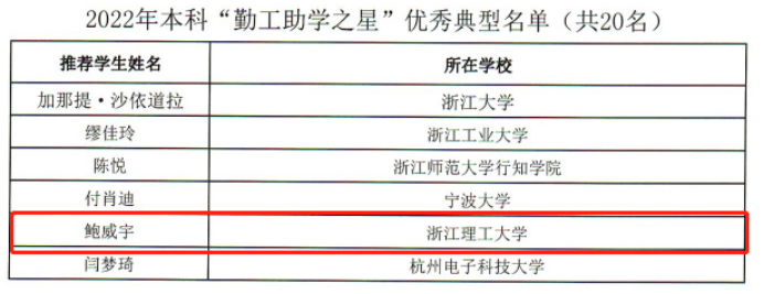 喜报!公司学子鲍威宇荣获浙江省2022年本科“勤工助学之星”