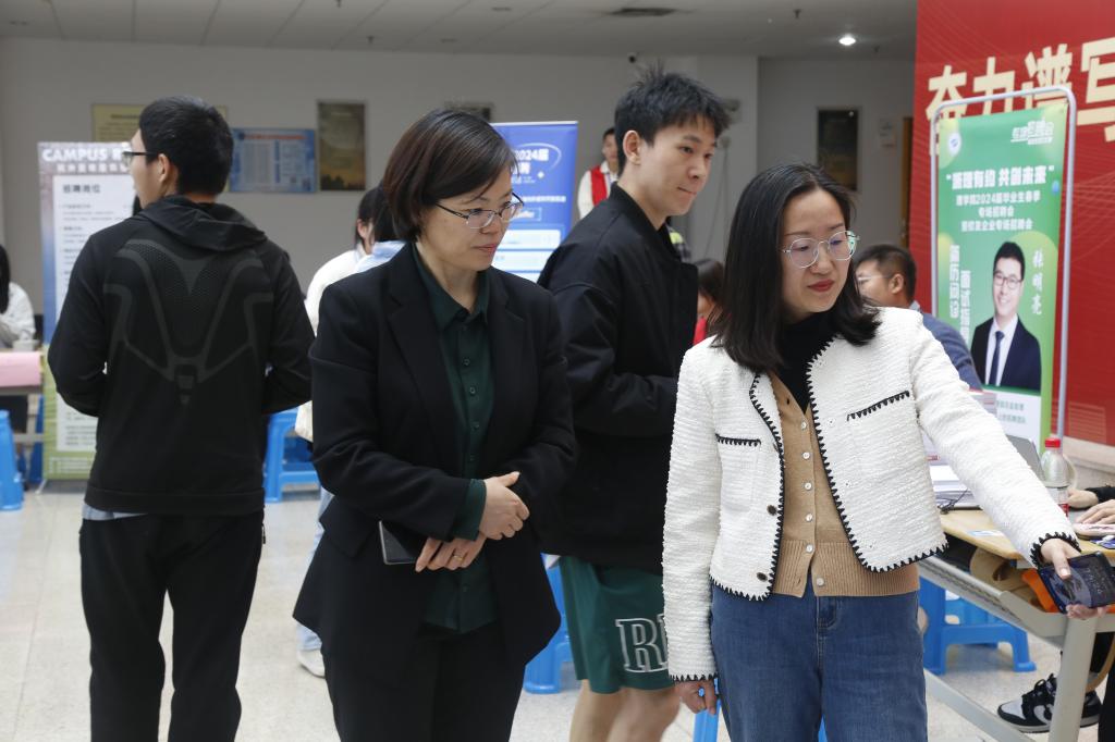 招聘会现场氛围热烈,毕业生们积极投递简历,了解用人单位的各项情况、薪资待遇及职业发展等,用人单位耐心细致地回答毕业生们的问题。浙江新东方培训学校人力资源部总监助理张明亮在现场为同学们提供简历指导,帮助同学们完善、优化简历,助力同学们求职“通关”。