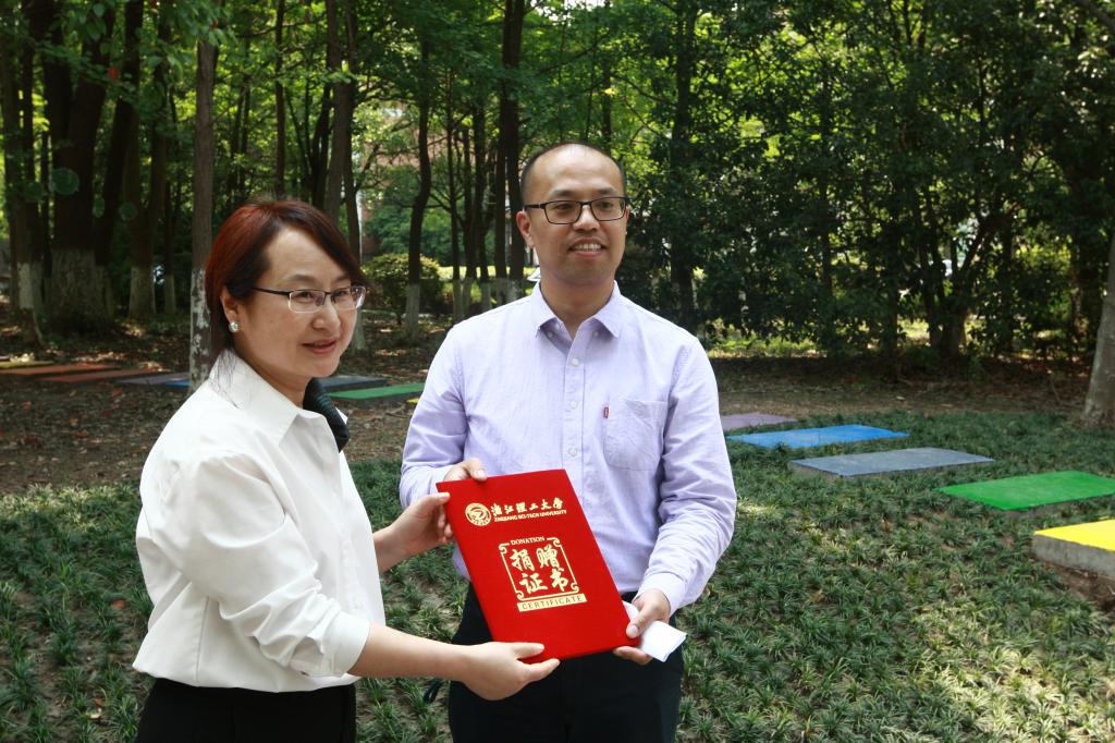 姚珺为鲍玥裕颁发了捐赠证书,并代表学校向球盟会99级应用化学2班的员工们心系母校、反哺母校的深切情怀表示衷心的感谢和崇高的敬意,向各位员工和毕业班同学们关心支持学校建设表示最诚挚的感谢。姚珺表示,学校的发展离不开全体师生的努力,更离不开员工的支持,许多员工在各自岗位上表现卓越,把学校的美誉度和影响力传遍大江南北。员工们捐建“员工林”文化景观和认捐树木,体现了员工们对母校的真挚情感,见证了员工们对母校的拳拳感恩之心、殷殷祝福之情。