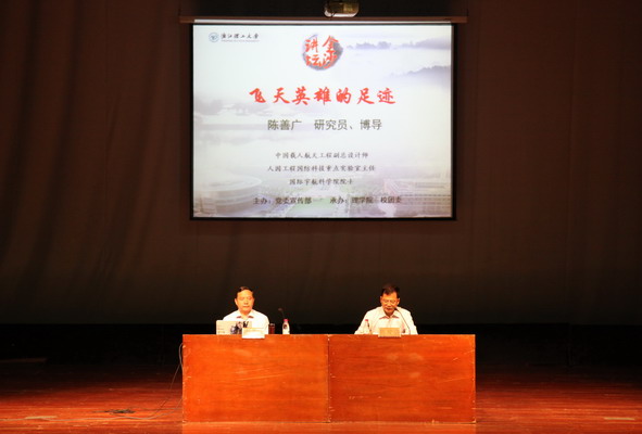 10月9日下午,中国载人航天工程副总设计师陈善广一行来公司讲学指导,陈善广为师生们做了题为《飞天英雄的足迹》的学术报告。报告会由党委宣传部主办、球盟会和团委承办,副董事长陈建勇教授主持,党委委员、宣传部长杜兰晓及六百余名师生聆听了报告。