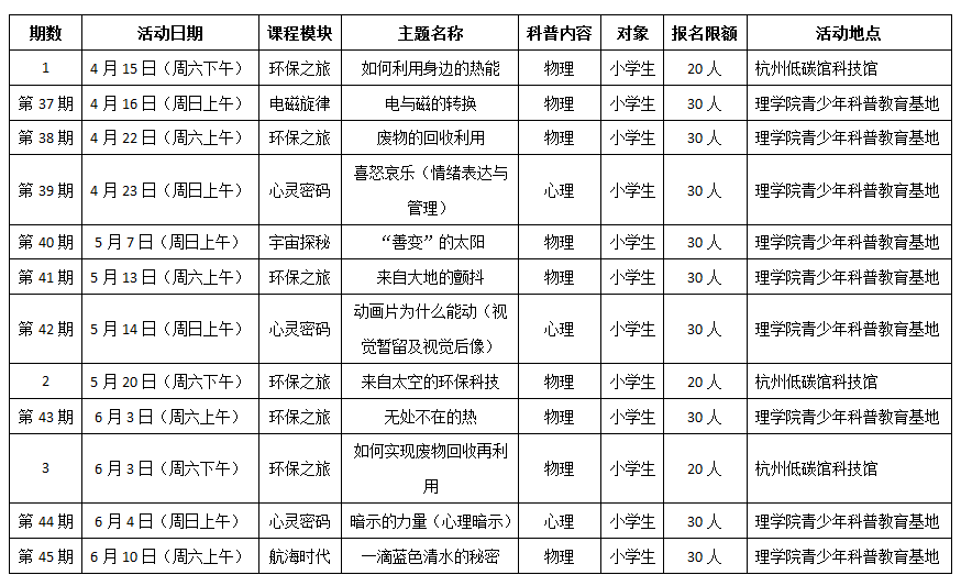2017年4月-6月期间将举办第37-45期青少年科普训练营,同时每月定期前往杭州市低碳科技馆开展科普活动1次。